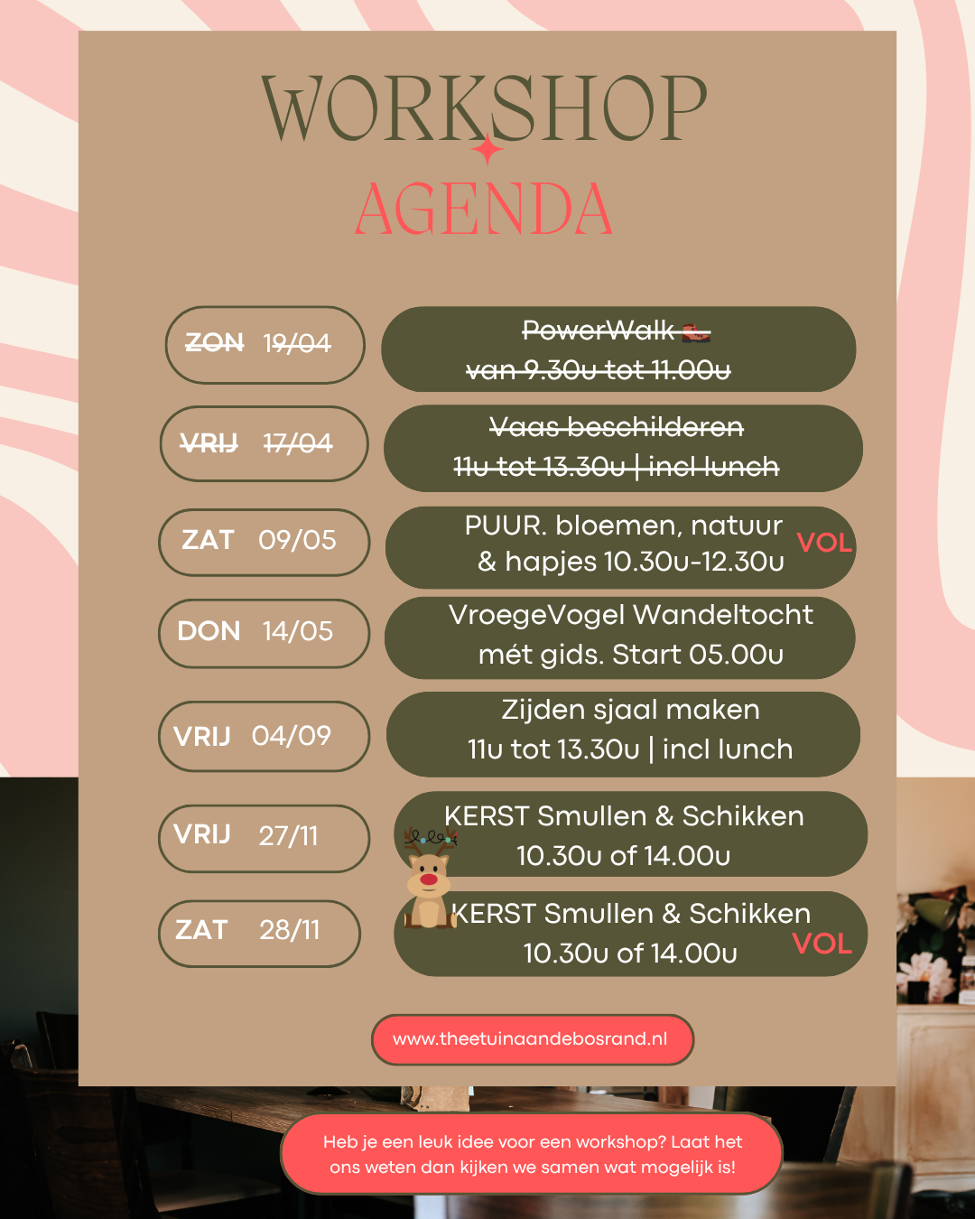 π Aanmelden kan via WhatsApp bij Heidi 06-37397460 of via mail: info@theetuinaandebosrand.nl